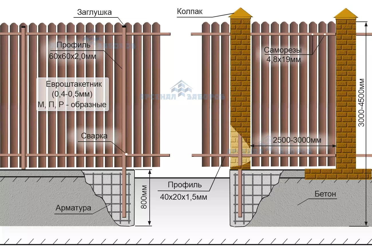 Компания «АрсеналЗаборов» производит установку под ключ забора из металлического штакетника с кирпичными столбами. Долговечность и надежность наших заборов побеспечена проверенными годами материалами. Узнать стоимость или оформить заказ Вы можете в режиме онлайн.